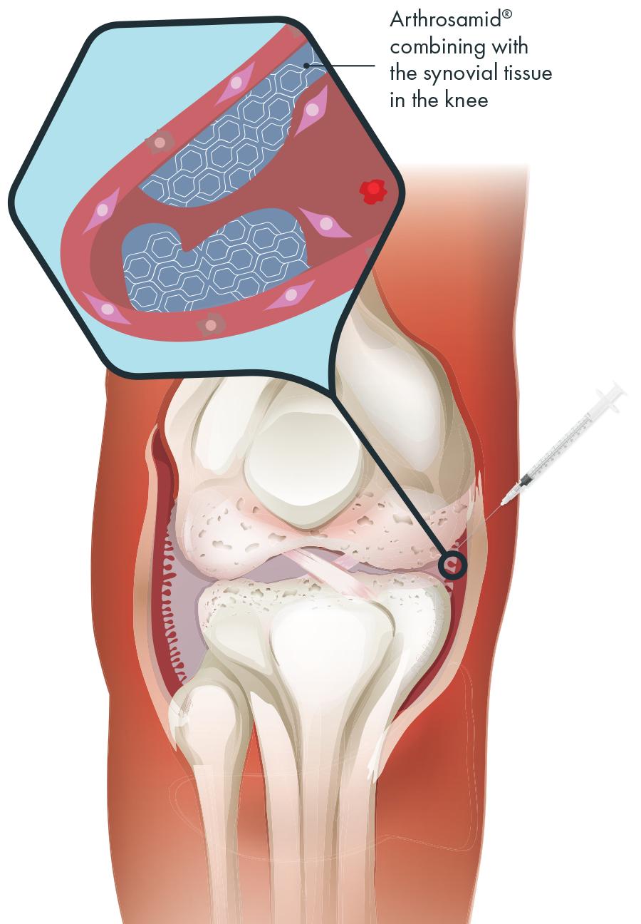 Arthrosamid® permanently combines with the tissue lining your knee joint, thickening it to provide a barrier.
